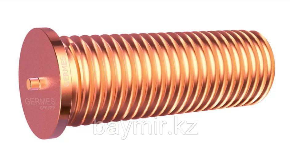 Шпильки приварные из омедненной стали. Крепеж устанавливается при помощи сварочного контактного автомата и отличается наличием контактной точки для монтажа. Под воздействием высоких температур, создаваемых сварочным аппаратом, шляпка крепежа расплавляется и жёстко вплавляется в металлическую поверхность. Резьбовая шпилька создает жёсткое крепление только с одной стороны, с другой стороны на неё устанавливается болт. Такое соединение позволяет регулировать жёсткость крепежа, а при необходимости и полностью его раскручивать.